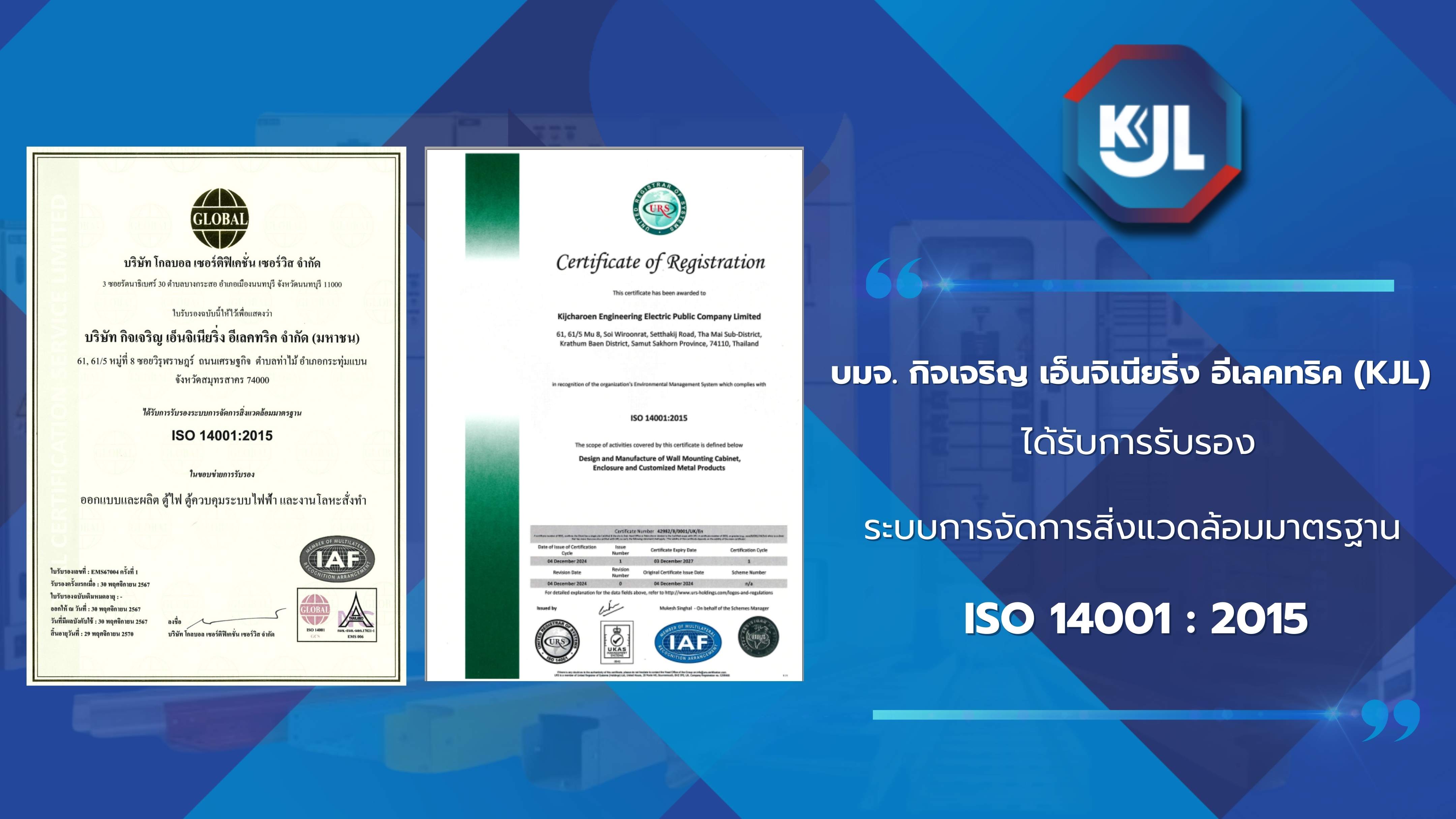 KJL ได้รับการรับรองมาตรฐาน ISO 14001:2015 มุ่งมั่นสร้างศักยภาพด้านสิ่งแวดล้อมสู่การพัฒนาอย่างยั่งยืน
